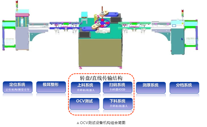 OCV(Open circuit voltage)測(cè)試設(shè)備處于鋰電池化成封裝段,可用于圓柱、軟包、方殼動(dòng)力等電池的檢測(cè)。它的目的是檢測(cè)電池的SOH(StateOfHealth),即電池的健康狀態(tài)。通過(guò)對(duì)成品電池的OCV檢測(cè),即:開(kāi)路電壓、電池內(nèi)阻和負(fù)極與殼體之間絕緣電壓的測(cè)量與數(shù)據(jù)分析,判定電池的狀態(tài)是否滿足性能指標(biāo),從而對(duì)電池分檔,保證電池的綜合性能。