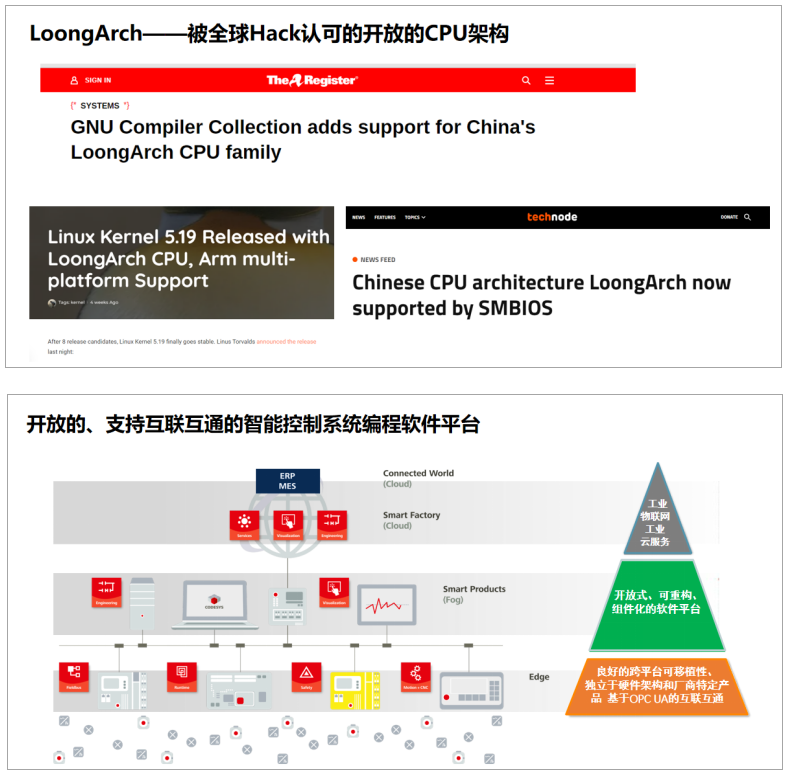 CODESYS 大中華區(qū)總裁馬立新先生在本次活動主論壇為大家分享《基于龍芯LoongArch 架構和 CODESYS 自動化軟件平臺的智能控制系統》主題報告。馬總在報告中指出:智能制造時代下,傳統控制需要向融合 AI 人工智能技術的智能控制轉變,智能控制可以解決那些用傳統控制方法難以解決的復雜系統的控制問題。而一個智能控制系統需要有高算力的硬件做支撐,以及具有自適應性的軟件做支持。龍芯推出了龍芯指令系統(LoongArch®),龍芯指令系統具有較好的自主性、先進性與兼容性。它從整個架構的頂層規(guī)劃,到各部分的功能定義,再到細節(jié)上每條指令的編碼、名稱、含義,在架構上進行自主重新設計,具有充分的自主性。龍芯指令系統摒棄了傳統指令系統中部分不適應當前軟硬件設計技術發(fā)展趨勢的陳舊內容,吸納了近年來指令系統設計領域諸多先進的技術發(fā)展成果。同原有兼容指令系統相比,不僅在硬件方面更易于高性能低功耗設計,而且在軟件方面更易于編譯優(yōu)化和操作系統、虛擬機的開發(fā)。LoongArch 成為被全球Hack認可的開放的 CPU 架構。