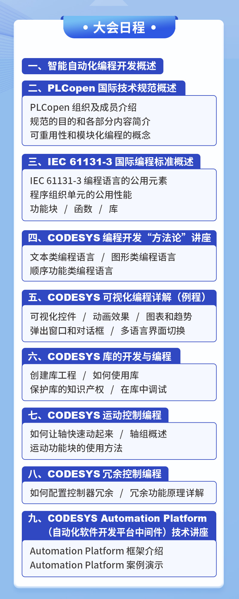 智能自動(dòng)化— CODESYS 編程開(kāi)發(fā)技術(shù)大會(huì)主要目的是幫助更多用戶學(xué)習(xí)智能自動(dòng)化時(shí)代的自動(dòng)化應(yīng)用編程、可視化編程和復(fù)雜運(yùn)動(dòng)控制編程,引導(dǎo)客戶在工廠自動(dòng)化、能源自動(dòng)化、軌道交通、樓宇自動(dòng)化、過(guò)程自動(dòng)化等多個(gè)行業(yè)或領(lǐng)域進(jìn)行業(yè)務(wù)擴(kuò)展。