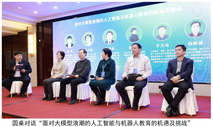 本次論壇上,來自山東大學、北京工商大學、齊魯工業(yè)大學、東北大學、北京工業(yè)大學的宋銳教授、田新誠教授、韓力群教授、曹茂永教授、趙姝穎教授、于乃功教授在主題為“面對大模型浪潮的人工智能與機器人教育之機遇及挑戰(zhàn)”的圓桌對話環(huán)節(jié),圍繞“以大模型為代表的AI工具對基礎教育有何影響?”、“大模型的快速發(fā)展將對人工智能教育的內容和方法、手段帶來哪些變革?作為教育工作者我們該如何應對?”、“大模型對機器人技術有何影響?機器人工程、智能制造工程等新工科專業(yè)應該如何應對?”、“大模型對于學生與老師之間的角色定位將產生何種影響? 如何更好地發(fā)揮它的作用?”、“大模型的快速發(fā)展對高校專業(yè)建設與人才培養(yǎng)將產生哪些影響?”等問題展開了深度研討,專家們從各個角度集思廣益、各抒己見,為人工智能助力人才培養(yǎng)及促進教學模式創(chuàng)新發(fā)展獻計獻策。