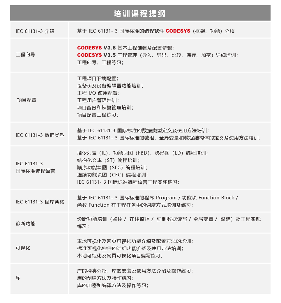 CODESYS V3 Basic Training 培訓課程以 CODESYS V3.5 Programming System(編程系統(tǒng))為主,詳細對IEC 61131- 3 國際標準編程語言進行培訓。