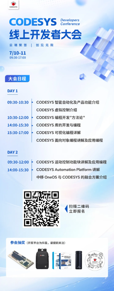 報(bào)名福利:會(huì)議期間以報(bào)名手機(jī)號(hào)參與抽獎(jiǎng),請(qǐng)?zhí)崆?span textstyle="" style="-webkit-tap-highlight-color:rgba(0, 0, 0, 0);margin:0px;padding:0px;outline:0px;max-width:100%;box-sizing:border-box !important;overflow-wrap:break-word !important;color:#C00000;font-weight:bold;">掃碼報(bào)名及關(guān)注抖音(抖音號(hào):CODESYS_China1),獲得中獎(jiǎng)機(jī)會(huì)。